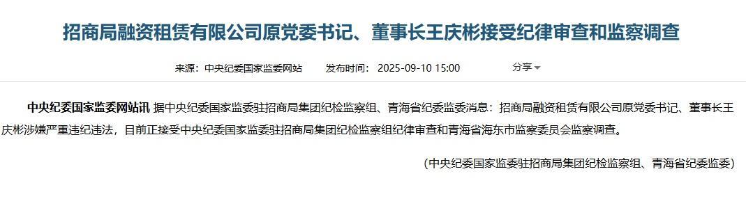9月10日优配中国,中央纪委国家监委网站通报,招商局融资租赁有限公司原党委书记、董事长王庆彬涉嫌严重违纪违法,目前正接受中央纪委国家监委驻招商局集团纪检监察组纪律审查和青海省海东市监察委员会监察调查。