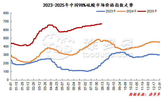 据涂多多数据测算股E融,8月11日硫酸市场价格指数为673.67,较上一工作日上调3.67,幅度0.55%。
