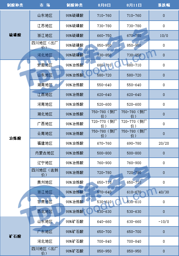 今日国内硫酸市场个别地区价格偏弱,截至目前,山东地区98%矿石酸出厂价格630-660元/吨,98%冶炼酸出厂价格在560-700元/吨,浙江地区98%冶炼酸出厂价格在610-670元/吨;下游化肥市场开工高位,浙江地区冶炼酸周末价格上调40元/吨;但硫磺酸出货情况有所转弱,下游市场采购情绪偏淡,而原料硫磺价格持续上涨,成本支撑下,价格或再有上涨预期;山东地区近期酸价趋弱运行,主力酸厂为降低库存压力,部分新单价格有所优惠,企业新单价格小幅下调;整体来看,硫酸市场价格多暂时持稳,个别地区价格小幅涨跌运行。