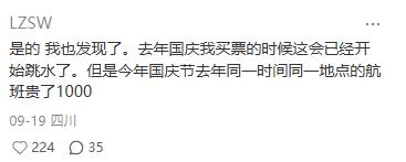 除了怒骂航司、平台大数据杀熟的,也有网友质疑十一机票套路变化,称"去年国庆我买票的时候这会已经开始跳水了,但是今年国庆节去年同一时间、同一地点的航班贵了 1000 元!"