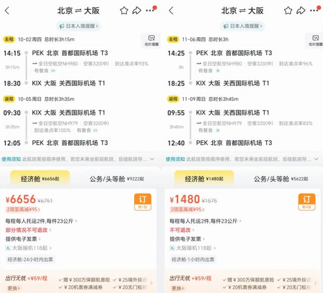 另一类是长线出境游客,发现机票已经呈现近几年前所未有的天价机票,北京欧洲经济舱机票直逼 3 万元,也有人对比北京—大阪的机票,比平时直接翻 4 倍还拐弯了,连连感慨假日经济太可怕了。